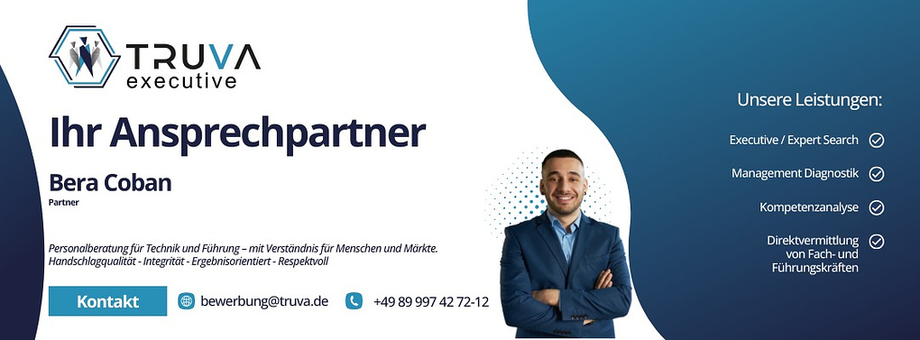 Dann bewerben Sie sich am besten über den Bewerbungsbutton: Wir behandeln Ihre Unterlagen natürlich vertraulich und diskret. Wir arbeiten immer nach der aktuellen DSGVO. Für erste Rückfragen stehe ich, Bera Coban, Ihnen unter 089 / 997 42 72 – 12 zur Verfügung. Sollte diese Position nicht vollständig passen, können wir uns gerne in einem unverbindlichen Telefonat über andere berufliche Möglichkeiten austauschen.