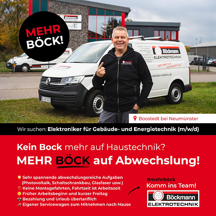 Die Böckmann Elektrotechnik GmbH & Co. KG ist ein erfolgreiches, auf Wachstum ausgerichtetes Dienstleistungsunternehmen der Elektrobranche im schönen Schleswig-Holstein. Wir bieten unseren Kunden seit mehr als 40 Jahren verbindlichen Kundenservice und verlässliche Partnerschaft, sowie umfassende professionelle Dienstleistungen in nahezu allen Bereichen des Elektrohandwerks.