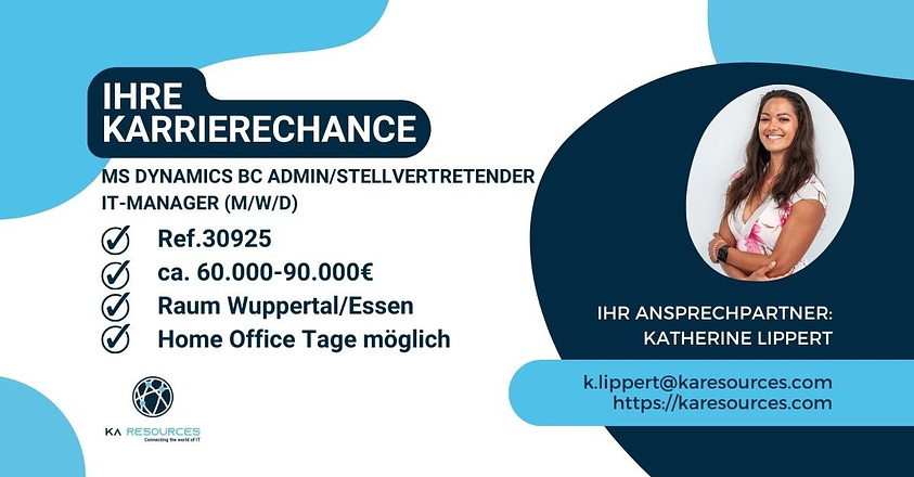 Mein Auftraggeber, ein mittelständischer und stetig wachsender Betrieb in Familienhand (2. Generation) aus der Produktionsbranche, der über 120 Mitarbeiter beschäftigt und dessen hochwertige Produkte seit mehr als 50 Jahren u.a. im Automotive-Umfeld und der Baubranche vertrieben werden, ist auf der Suche nach einem stellvertretenden IT-Manager bzw. Administrator (m/w/d) für Microsoft Dynamics 365 Business Central in unbefristeter Festanstellung für das Headquarter im Raum von Wuppertal/Essen. Der Standort ist auch aus den Richtungen Dortmund, Düsseldorf, Köln und Mönchengladbach gut aus zu erreichen.