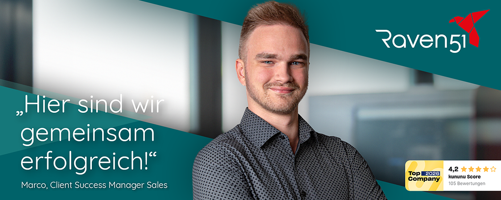Hey! Ich bin Marco, Client Success Manager, bei Raven51. Als Teil des Sales Teams gewinne ich neue Kunden für unsere Recruiting- und Employer-Branding-Lösungen: strukturiert, zielorientiert und das überwiegend via Telefon oder Microsoft Teams. Wenn du Spaß daran hast, Gespräche zu führen, Potentiale zu erkennen und Unternehmen bis zum konkreten Angebotswunsch zu begleiten, bist du bei uns genau richtig: Wir arbeiten professionell, leistungsorientiert und kollegial - nach der Einarbeitungsphase mit bis zu drei Tagen mobilen Arbeiten pro Woche und einem Team, das Vertrieb ernst nimmt.