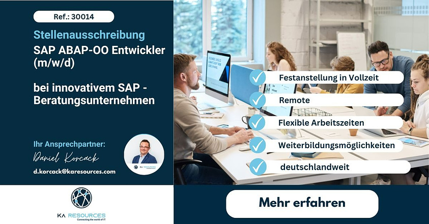 Bringen Sie Ihre Leidenschaft für saubere, effiziente ABAP-Entwicklung in ein Umfeld ein, das Innovation und Teamarbeit wirklich lebt. Für unseren Kunden, ein etabliertes deutsches Beratungsunternehmen. suchen wir Sie als SAP ABAP-OO Entwickler (m/w/d). Wenn Sie Freude daran haben, gemeinsam im Team maßgeschneiderte Lösungen zu entwickeln, Herausforderungen anzupacken und Ihr Know-how in abwechslungsreiche Projekte einzubringen, dann ist diese Position genau das Richtige für Sie.