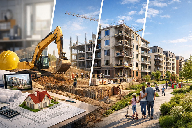 Steuerung und Koordination des gesamten Projektentwicklungsprozesses – von der Grundstücksakquisition über die Planungs- und Genehmigungsphase bis zur Baureife