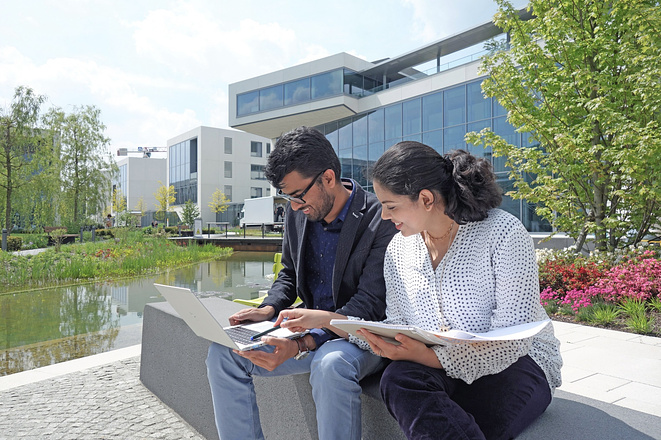 Großer, moderner Campus: Open Space-Büros, Terrassen, Betriebsrestaurant mit vegetarischen und veganen Optionen, gemütliches, italienisches Bistro mit Eisverkauf, Fitness-Studio und Kita