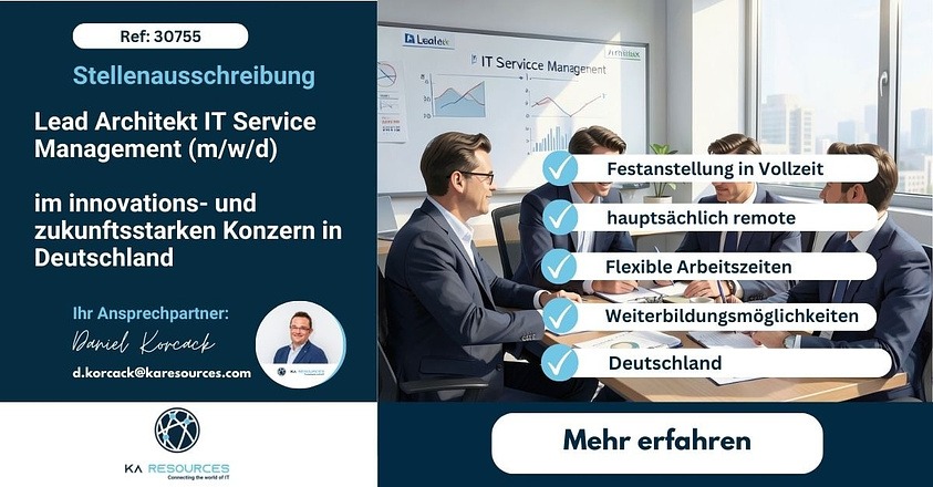 Mehr Informationen finden Sie hier: https://karesources.com/job/lead-architekt-itsm-deutschland/