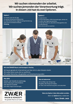 Wir bauen ein Unternehmen auf, das anders denkt und arbeitet. Menschen, die gestalten wollen und nicht nur ausführen, finden bei uns die richtige Umgebung. Wer mitdenkt, sorgfältig arbeitet und gerne Verantwortung übernimmt, kann bei uns schnell wachsen.