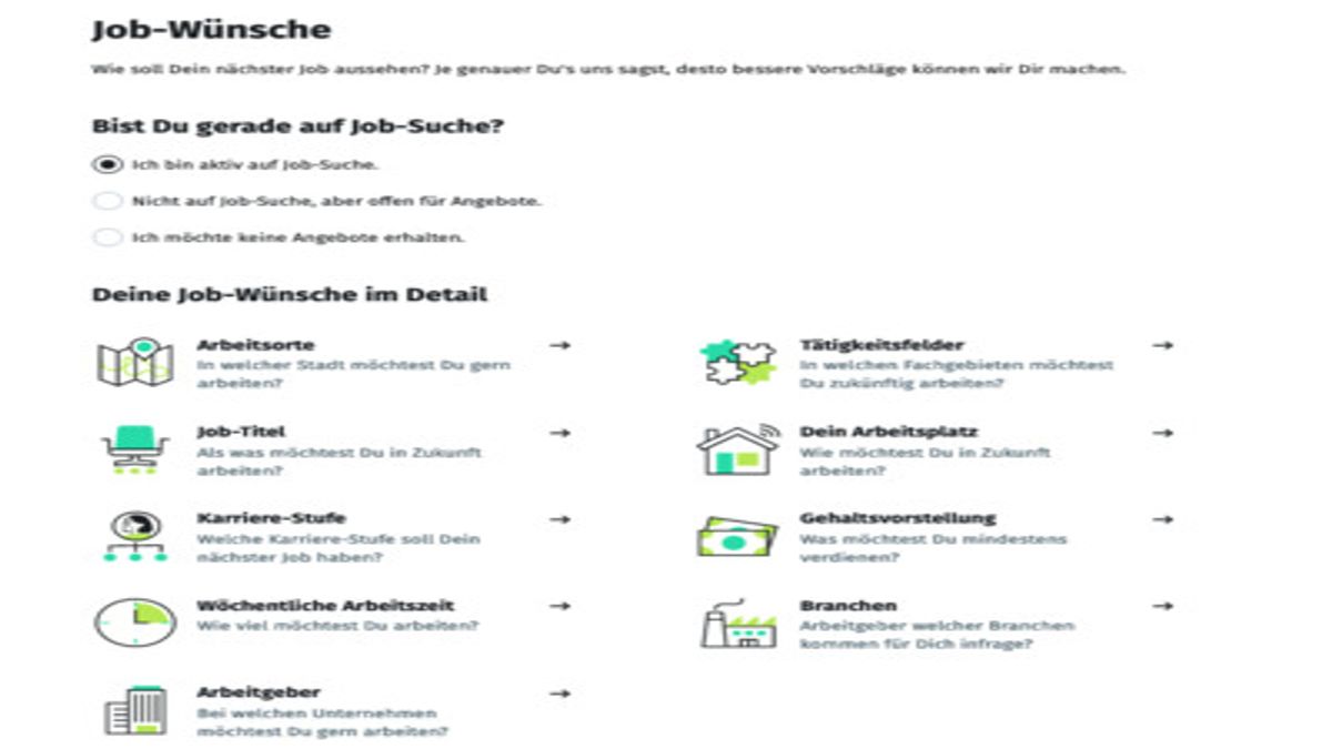 Schritt 2: Gib Deine Wünsche detailliert an. Gehaltsvorstellung, wöchentliche Arbeitszeit, Lieblingsbranche – nur so lässt sich das „Perfect Match“ für Dich finden. Empfohlene Herangehensweise: Überlege genau, was Du NICHT (mehr) willst. Schließlich möchtest Du mit Tierhaarallergie lieber keine Katzenbesitzerin daten und ganz sicher keinen Formel-1-Fahrer, wenn Du freitags fürs Klima auf die Straße gehst.