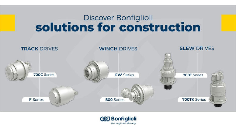 Discover Bonfiglioli solutions for the construction industry, a wide and diversified range of products for every application need: from excavators, drills, construction cranes, milling machines and much more. For over 40 years Bonfiglioli has been improving the performance, efficiency, and productivity of machinery and advanced technological solutions for your business.